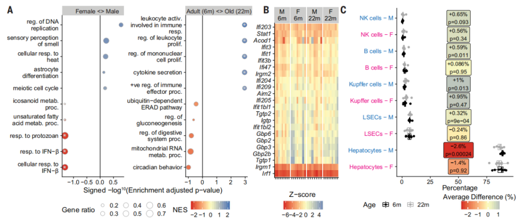 为了优先考虑长寿位点下的基因,研究人员分析了成年和老年小鼠的肝脏基因表达,以寻找性别、年龄和基因驱动的表达差异。他们发现,雌性小鼠肝脏中干扰素相关基因表达量较高,而老年小鼠肝脏中免疫相关基因表达量过高。