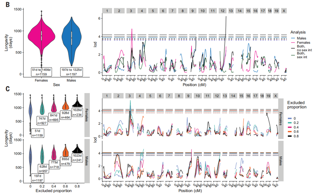 当联合分析雄性小鼠和雌性小鼠时,研究人员在第12号染色体上(小鼠有20对染色体)获得了一个先前描述过的长寿位点。令人意外的是,当将雌雄小鼠分别进行分析时,雄性和雌性有不同的长寿基因决定因素。