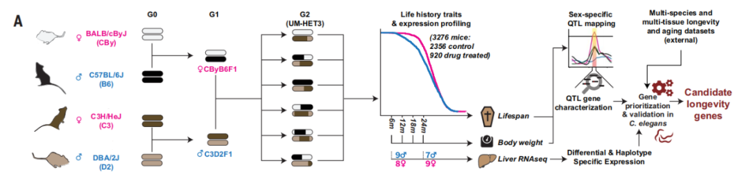 在这项最新研究中,研究团队对3276只UM-HET3小鼠的长寿基因调控因子进行筛查,这些小鼠被用于美国国家衰老干预试验计划(NIA ITP)的长寿研究。研究人员调查了长寿的遗传基础与性别、年龄和环境因素的联系。