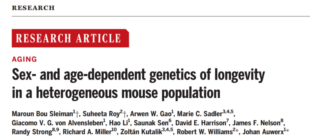 2022年9月30日,瑞士洛桑大学和美国田纳西大学健康科学中心的研究团队在国际顶尖学术期刊 Science 上发表了题为:Sex- and age-dependent genetics of longevity in a heterogeneous mouse population 的研究论文。