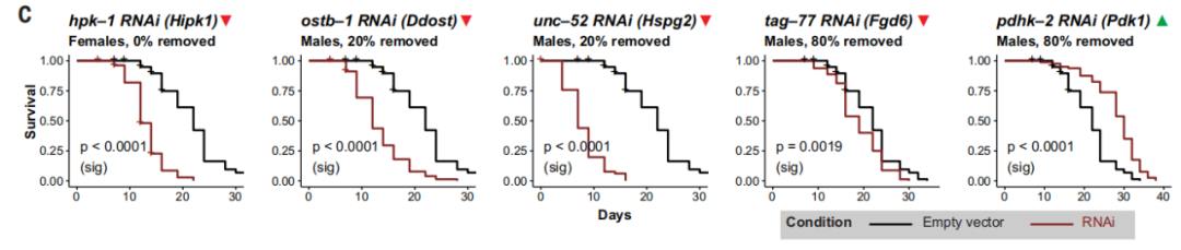 基于此,研究团队确定了常见的年龄和性别特异性遗传效应,并将其与模型生物和人类数据相结合,以创建一个假设构建的优先长寿和体重基因的交互式资源。最后,研究人员使用秀丽隐杆线虫寿命实验验证了 Hipk1、Ddost、Hspg2、Fgd6 和 Pdk1 为保守的长寿基因。