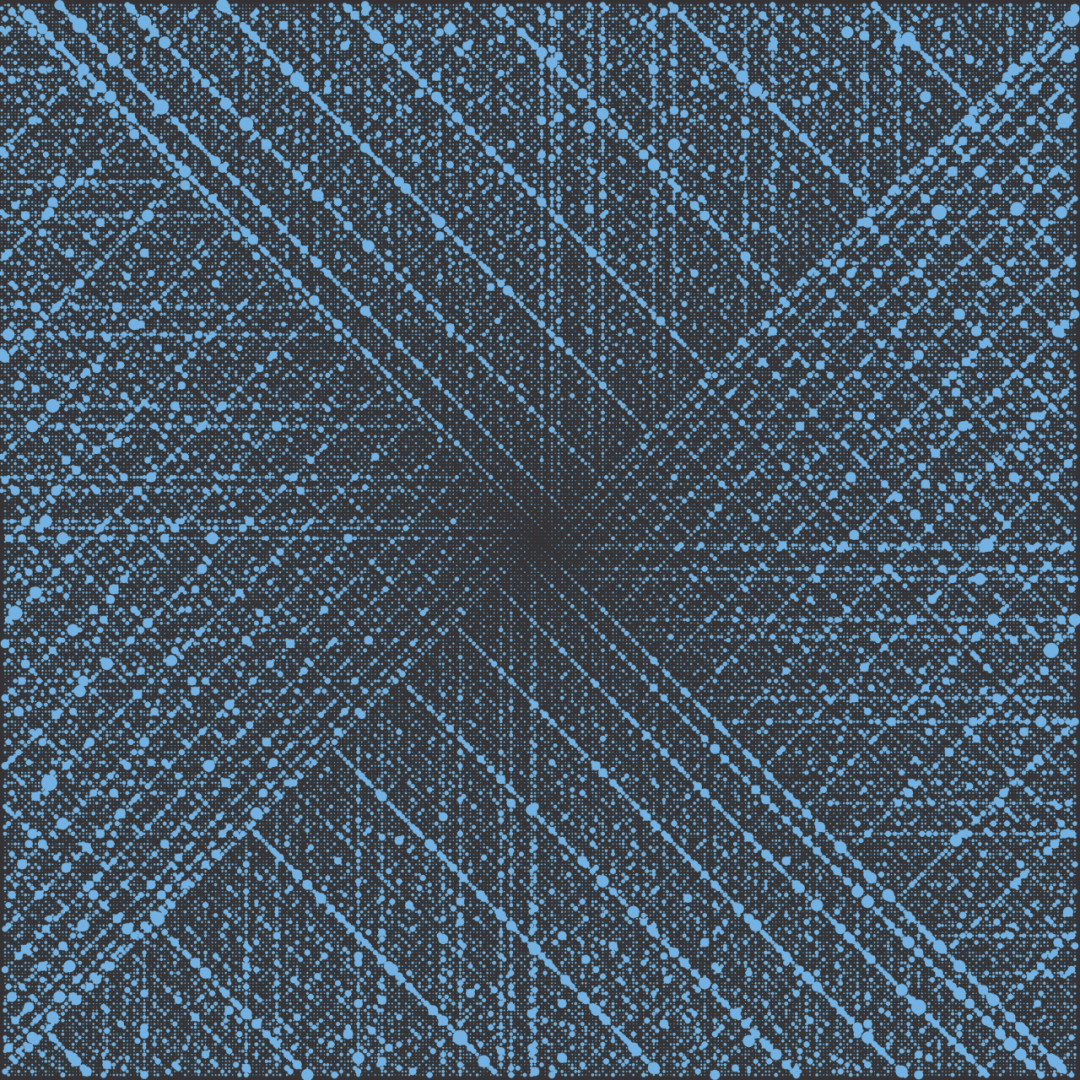 乌岚螺旋(Ulam Spiral)揭示了素数的一些结构。如果把计数的数字排列成正方形并向外旋转,就会发现许多素数落在对角线上。(图/Cortexd, Wikimedia Commons, CC BY-SA)