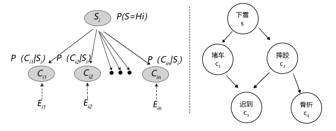 把某种现象的相关参数连接起来,再把数据代入贝叶斯公式得到概率值公式结网形成一个成因网,即贝叶斯网络,如下图所示: