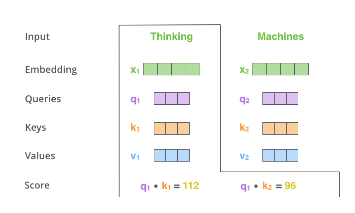 (2) 接下来就要计算注意力得分了,这个得分是通过计算Q与各个单词的K向量的点积得到的。以X1为例,分别将Q1K1K2进行点积运算,假设分别得到得分112和96。