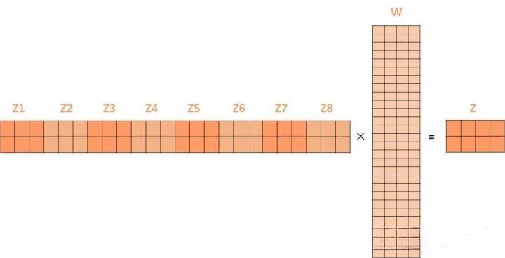 经过多头注意力机制后,就会得到多个权重矩阵Z,我们将多个Z进行拼接就得到了Self-attention层的输出: