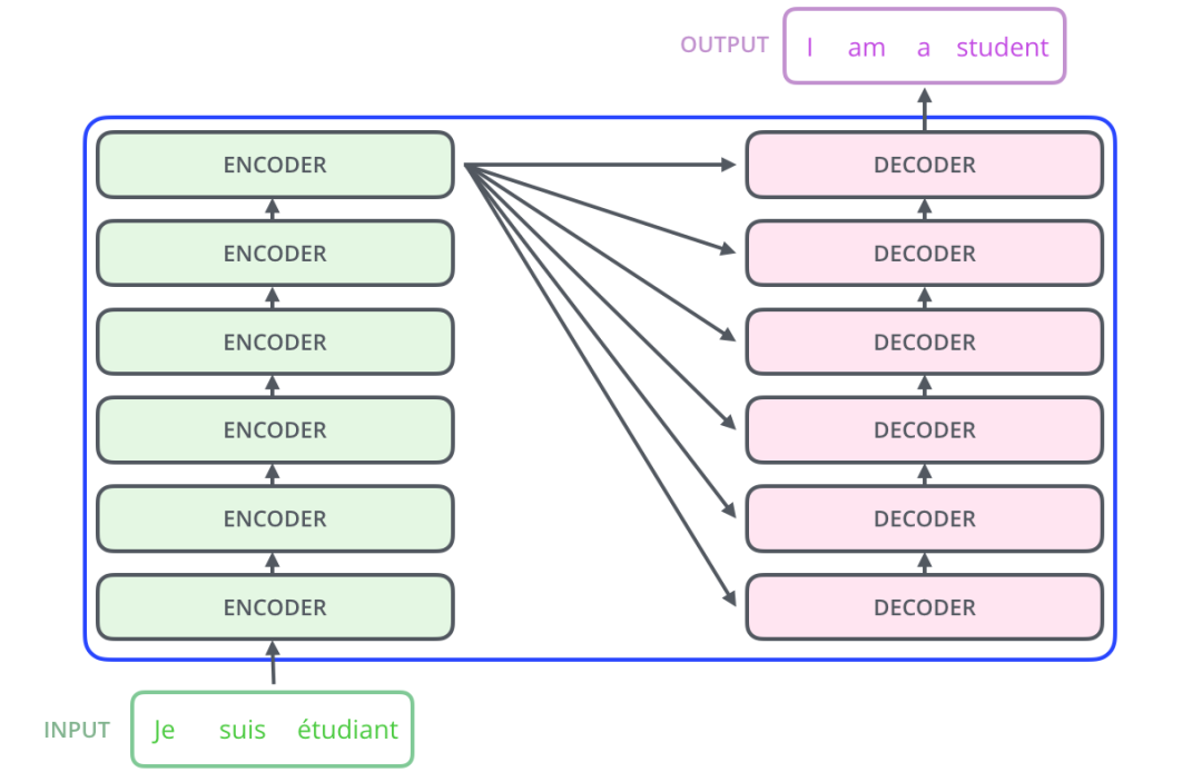 细心的同学可能已经发现了,上图中的Decoders后边加了个s,那就代表有多个编码器了呗,没错,这个编码模块里边,有很多小的编码器,一般情况下,Encoders里边有6个小编码器,同样的,Decoders里边有6个小解码器