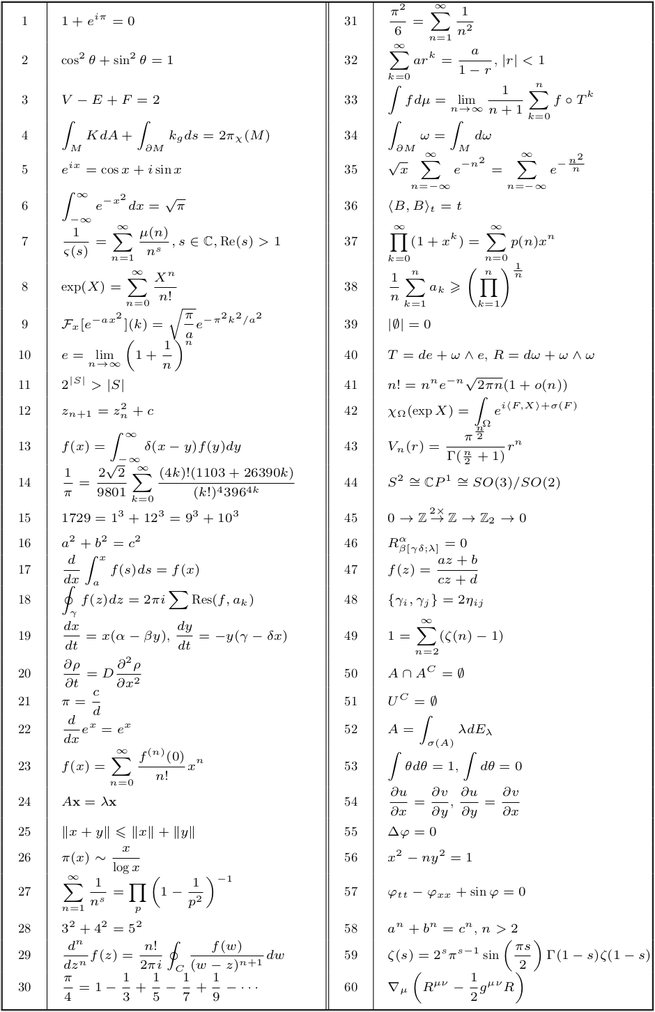 阿蒂亚与泽基的 60 个公式(上表列出阿蒂亚为这次实验选的 60 个公式,本来的文件中还有各公式的简短说明,但这里因篇幅限制删除。)