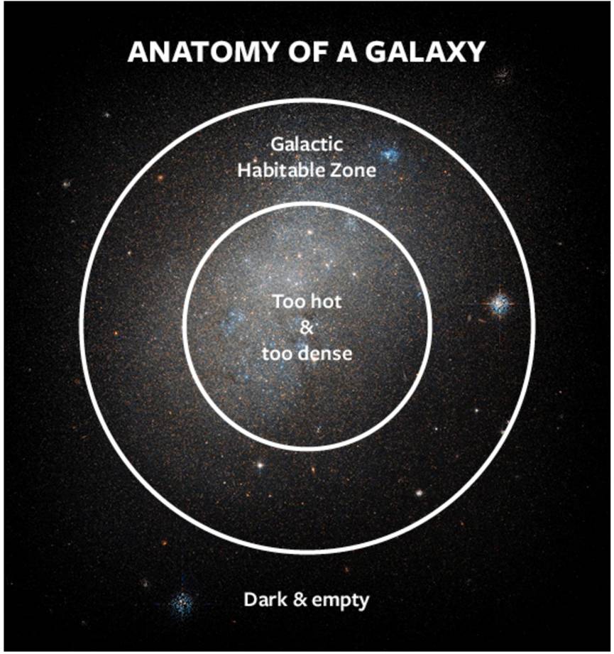 一个理想星系:上图是一个理想情况下的星系,该星系的初始密度涨落(即Q值)很大,但却可能拥有比银河系数量更多的宜居行星。该星系的中心区域对生命来说太热太亮,行星轨道也并不稳定;但是星系外围却接近太阳系的外围环境。在外围与中心区域之间,行星从背景天体接收到的光能强度类似地球接收到的日光。所以该区域的所有行星,不管其以何种轨道运行,在理论上都是宜居的。