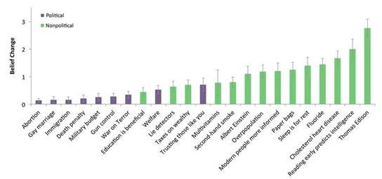 这些同样反映在一份调查问卷中。卡普兰发现,参与者对政治观点的敏感性要强于非政治观点。如下图所示,横轴是不同主题,纵轴是信仰变化。人们对爱迪生成就的看法很容易改变。但在堕胎、同性婚姻、移民这些问题上人们绝不妥协。