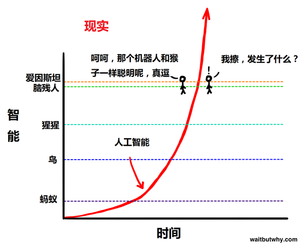 现在关于人工智能什么时候能达到人类普遍智能水平还有争议。对于数百位科学家的问卷调查显示他们认为强人工智能出现的中位年份是2040年——距今只有25年。这听起来可能没什么,但是要记住,很多这个领域的思想家认为从强人工智能到超人工智能的转化会快得多。以下的情景很可能会发生:一个人工智能系统花了几十年时间到达了人类脑残智能的水平,而当这个节点发生的时候,电脑对于世界的感知大概和一个四岁小孩一般;而在这节点后一个小时,电脑立马推导出了统一广义相对论和量子力学的物理学理论;而在这之后一个半小时,这个强人工智能变成了超人工智能,智能达到了普通人类的17万倍。