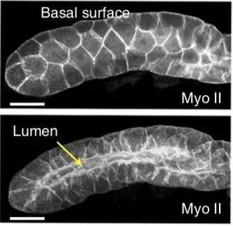 ○  果蝇唾液腺上皮组织中的盾形体结构。上图为腔体外表面(basal surface),下图为腔体内表面(lumen)。| 图片来源:DOI: 10.1038/s41467-018-05376-1