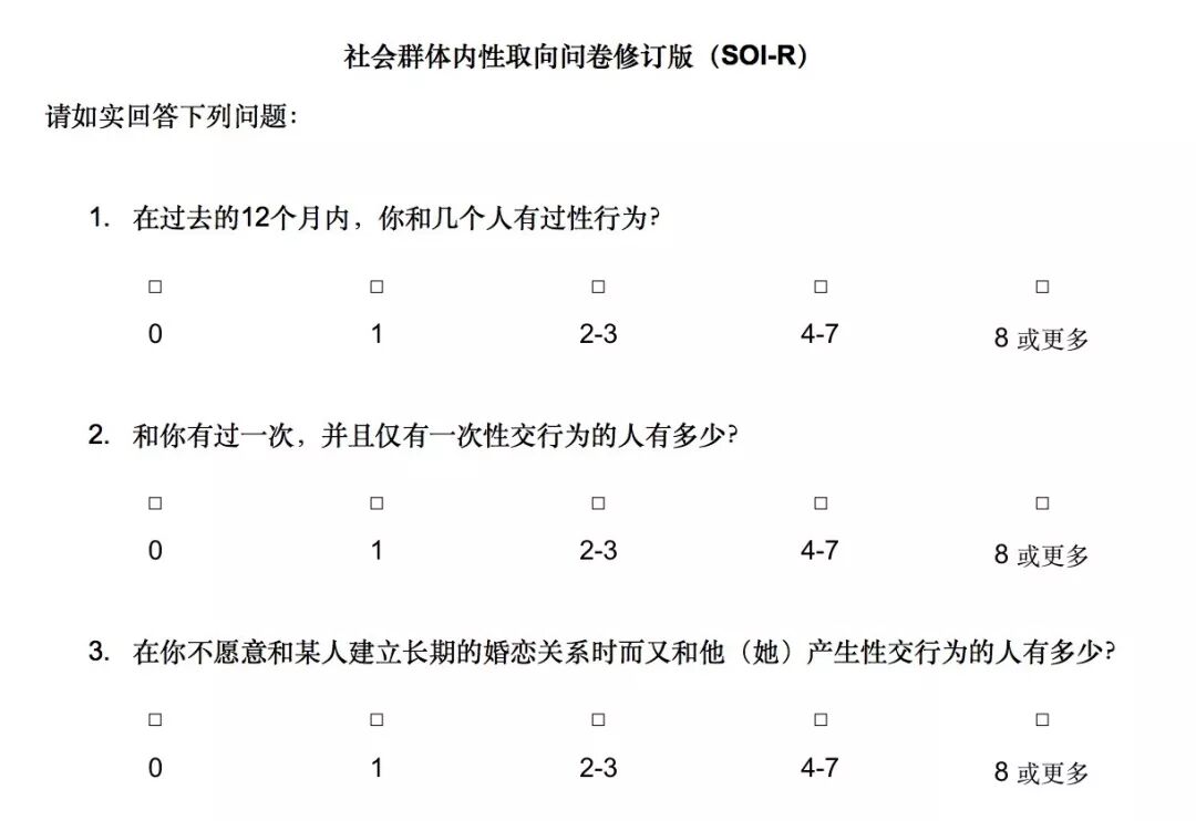 Noch ein Bass im Aermel来自利维坦利维坦按:社交性性关系(sociosexuality)是指人们任意发展未作承诺的性关系,这种性关系往往与亲密承诺及感情因素无关。为了描述这种性关系,杰弗里·辛普森(Jeffry Simpson)和史蒂文·冈格斯塔德(Steven Gangestad)编制了社交性性行为取向量表(Sociosexual Orientation Inventory,SOI)。根据得分的高低,可以将社交性性行分为有限制和无限制的。辛普森和冈格斯塔德发表社交性性行为论文以来,SOI逐渐被很多人所使用,其中不仅有社会和进化心理学家还有人格和性行为研究者,成为研究人类个体差异的重要工具。