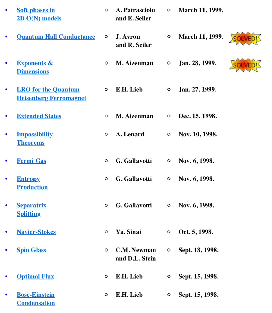 Michael Aizenman是普林斯顿大学的物理和数学教授,在他的手上,有一张在1998年-1999年罗列的“愿望清单”。这张清单上记录的是数学物理领域中最令人困惑的13个开放难题(数学物理是一个运用严格的数学推理来解决物理问题的领域)。就像克雷数学研究院在2000年提出的千禧年大奖难题一样,这些问题都是无数学者毕生所追求的目标。