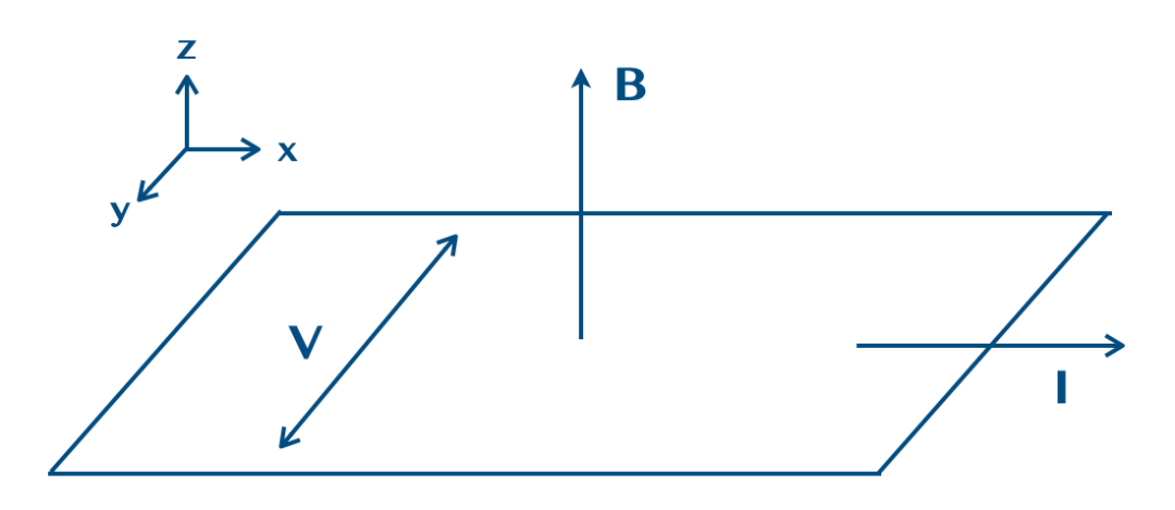 ○  经典霍尔效应是带电粒子在磁场中运动的简单结果。这里显示的是一个简单的实验示意图:开启一个指向z-方向的恒定磁场(B);在x-方向上存在一个恒定的电流(I);同时,电子只能在于(x,y)平面内。根据霍尔定律,这样的设置会在y-方向产生电压(V)。霍尔效应之所以会出现,是因为磁场会使得带电粒子绕圈圈运动。