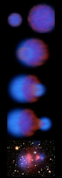 ○ 两个具有相同普通物质与暗物质分布的星系相互碰撞,计算结果表明,普通物质(红色)会相互作用、碰撞,而暗物质(蓝色)却像个冷静的旁观者。这与最后一张图中,通过引力透镜观测到的普通物质与(推测存在的)暗物质状况类似。| 图片来源:[1]