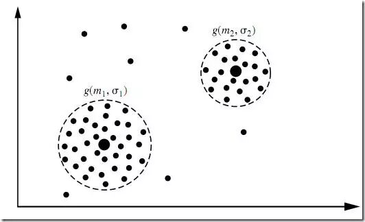 聚类是一种无指导的机器学习问题,问题描述:给你一堆数据点,让你将它们最靠谱地分成一堆一堆的。聚类算法很多,不同的算法适应于不同的问题,这里仅介绍一个基于模型的聚类,该聚类算法对数据点的假设是,这些数据点分别是围绕 K 个核心的 K 个正态分布源所随机生成的,使用 Han JiaWei 的《Data Ming: Concepts and Techniques》中的图: