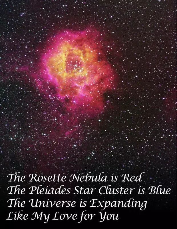 NGC 2237星云可能是全宇宙最浪漫的星云——它又称“玫瑰星云”,像一朵巨大的玫瑰绽放在宇宙中。上面这首诗由史蒂夫·萨沙(Steve Sartha)和克里斯·英(Chris Ing)创作,用天文学中的意象表达了浓浓的爱意。