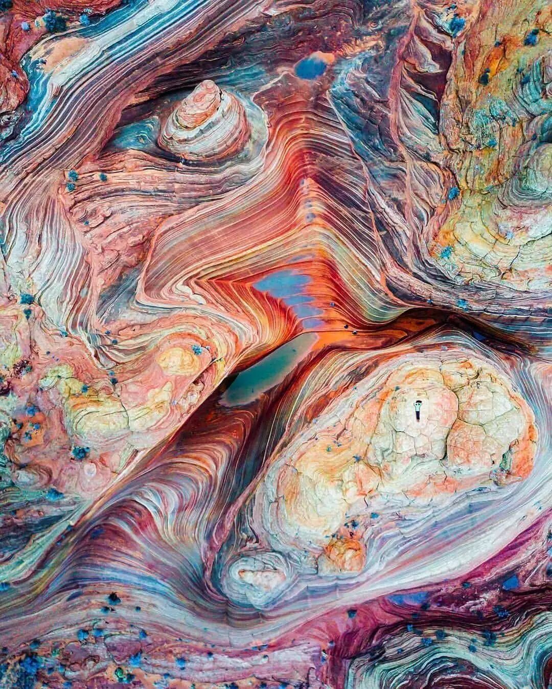 将红色含铁岩石、蓝色含锰岩石裸露在外