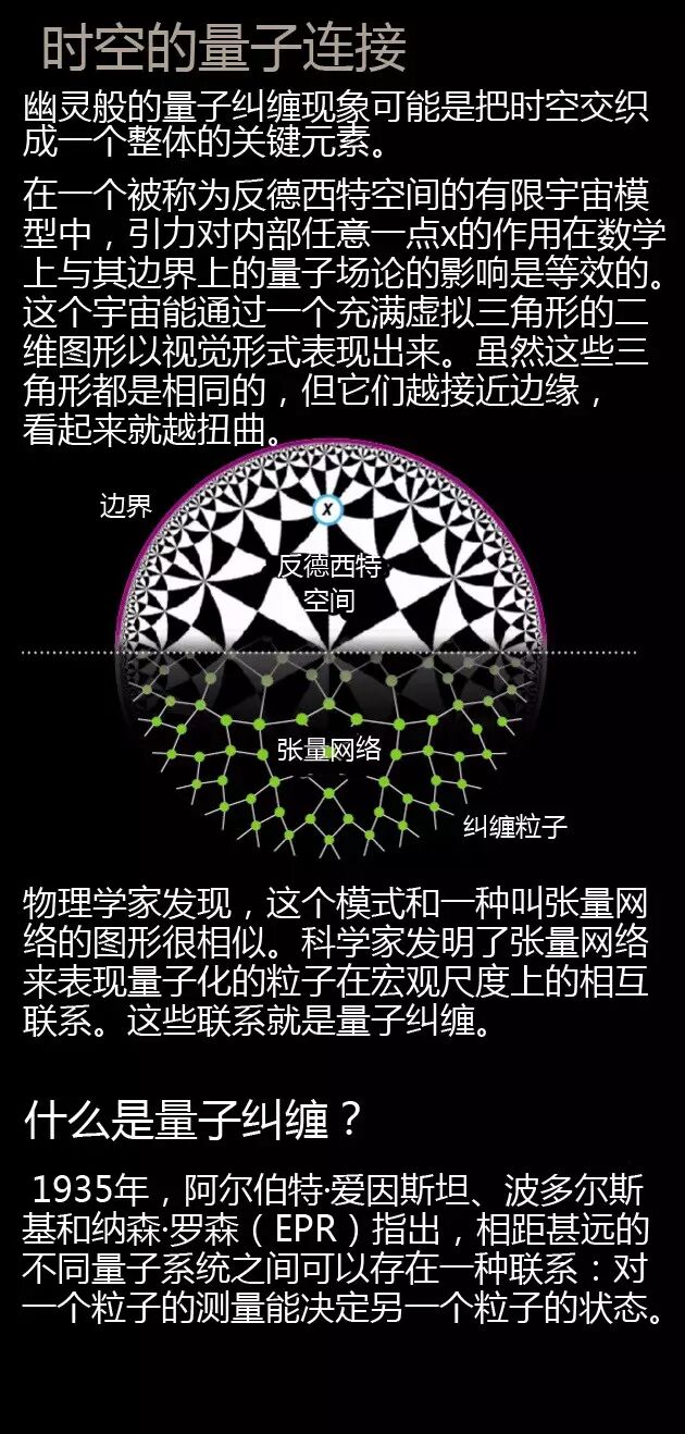 例如,2013年,Maldancena和斯坦福大学的Leonard Susskind发表了一个相关的猜想。为了致敬1935年发表的两篇革命性的论文,这个猜想被命名为“ER = EPR”。其中一篇论文“ER”是爱因斯坦和美籍以色列物理学家Nathan Rosen合作撰写的,介绍了如今被称作“虫洞”的现象:一个穿越时空联结两个黑洞的通道。(尽管科幻电影常把虫洞当做宇宙旅行的捷径,但事实上没有粒子能够穿越这样的虫洞,因为只有以超光速运动才能做到这点,而这是不可能的)。另一篇论文“EPR”是爱因斯坦,Rosen和美国物理学家Boris Podolsky合作撰写的,是第一篇清楚地描述一种量子现象的论文,这个现象现在被称为量子纠缠。