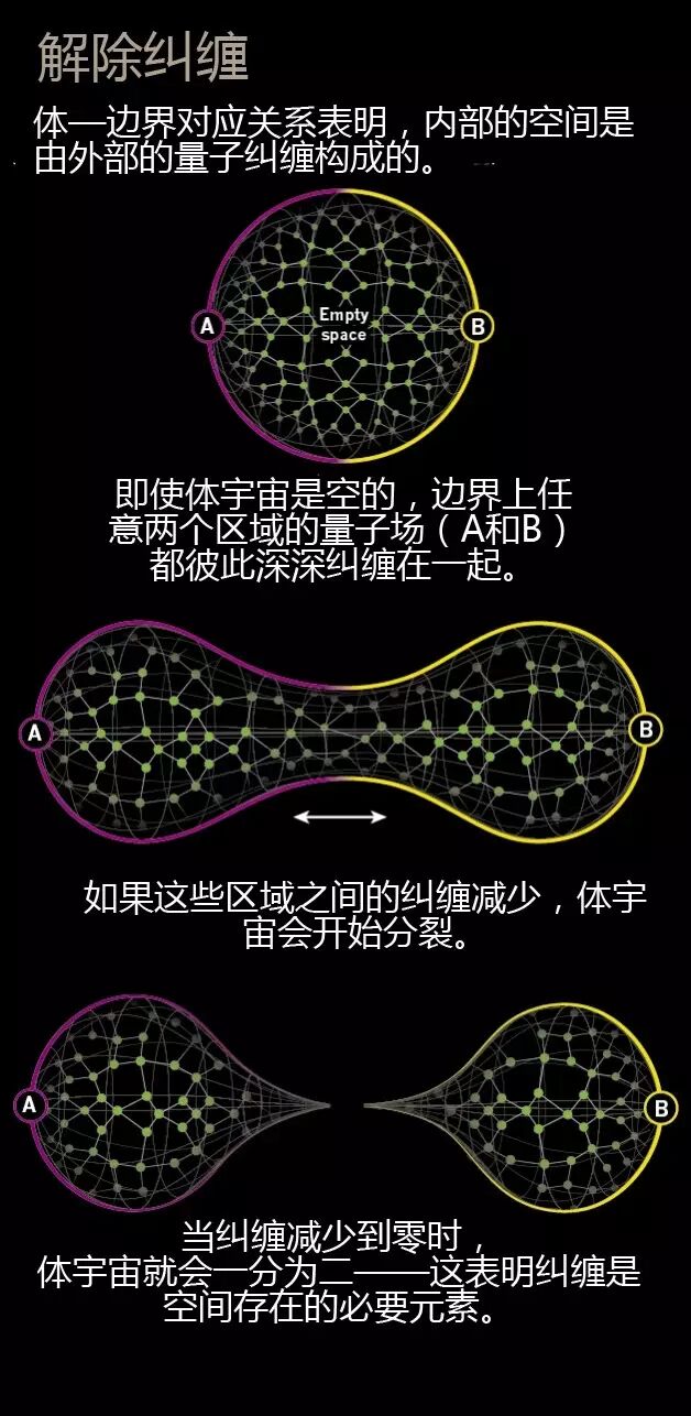 Van Raamsdonk能够用Shinsei Ryu和Tadashi Takanagi 在2006年提出的数学工具来回答这个问题。这两人现在分别就职于伊利诺伊大学香槟分校和日本京都大学基础物理研究所。利用他们的方程,Van Raamsdonk可以建立一个边界上量子场的纠缠在缓慢而又有条不紊地减弱的模型,同时观察该模型中体宇宙的反应,他注意到,体宇宙的时空被逐步拉伸并撕裂了(见“时空的量子连接”)。最终,他发现,把纠缠减少为零会把时空打破成不连续的碎块,就像被拉扯得太长的口香糖。