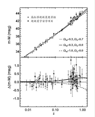 这里L为天体的内禀光度。利用这两类方法测量的距离分别被称为角距离和光度距离。 最早跨出太阳系的距离测量是所谓三角视差方法,天文学家通过测量不同季节恒星在天球的视角差,根据三角学原理计算出恒星的距离。原理上它可以归类到标准尺方法,只是标准尺是放置在本地,其长度为地球到太阳的距离。不过,三角视差法只适合于400光年以内的恒星的距离测量。超过这个尺度,由于视差太小,地面上的传统测量已不再奏效。 对更遥远的天体,天文学家根据恒星演化的赫罗图发展了一种所谓的分光视差法。赫罗图由丹麦天文学家赫茨普龙和美国天文学家罗素分别于1911年和1913年各自独立提出,它给出了恒星表面温度和光度之间的相关性,同时也是恒星演化轨迹的重要示踪器。我们知道,恒星的表面温度通常用它表观的颜色标示,在天文上也被称为光谱型。因此,借助于赫罗图,我们可以通过测量恒星的光谱确定它的绝对光度,继而由观测所得的视光度计算出它的距离。 另一种和恒星内禀性质相关的方法则是著名的造父变星法。造父变星是勒维特最早发现的一类在径向方向交替进行膨胀和收缩的恒星,其光度随时间发生周期性起伏。它具备一个重要的性质,即它的绝对光度和起伏的脉动周期之间存在确定的关系,称为周光关系。如果我们通过长期的时域监测获得它的光度起伏周期,我们就可以推断出它的绝对光度。和分光视差法的思想类似,通过测量表面亮度我们就可以定出它的距离。源于造父变星法的测量距离可以延伸到百万秒差距之巨,它也被誉为“量天尺”。一个熟知的历史事实是,正是通过造父变星法,哈勃将人类的视野拓展到银河系外,并带给我们宇宙膨胀的壮丽图景。 对于更遥远的宇宙学尺度的距离测量,天文学家则需要寻找更亮的标准烛光或标准尺作为测量参考对象。 超新星是恒星演化走向终结的一次最为壮观的爆发现象,其瞬间爆发产生的亮度可以和整个星系的光度相比。而其中被归类到Ia型的一类超新星,由于其近乎相同的峰值爆发亮度,使它成为观测宇宙学中最富吸引力和应用价值的标准烛光。 在爆发机制上,Ia型超新星被认为是发生在双星系统中的晚期产物,其中一颗恒星在耗尽所有热核燃料后,会逐渐冷却成为以碳氧为其主要成分的白矮星。在其晚期演化中,白矮星会不断从伴星包层中吸积物质。当吸积物质累积使整个白矮星质量达到钱德拉塞卡质量极限时,电子的简并压力已不足以抵抗引力坍缩,并触发剧烈的热核反应。对双星系统而言,这一事件是灾难性的,核燃烧产生的动能释放直接导致双星系统的解体,而随后发生的剧烈爆炸更使其亮度超过我们太阳的数十亿倍。由于Ia型超新星的触发临界点是钱德拉塞卡极限, 这里为普朗克质量, 是质子的质量, 为太阳质量。显然,这是一个普适的质量,只依赖于基本物理常数。考虑到可以获得的核爆炸物质具有恒定的数量,物理上我们容易理解为什么Ia型超新星具有接近的爆发强度。 测量宇宙早期的膨胀历史,Ia型超新星是最为理想的采集样本。随着大规模信息技术的发展,特别是具有大天区搜寻能力的CCD相机以及高性能超级计算机的应用,Ia型超新星的搜寻和分析在上世纪90年代后期取得具有历史意义的突破。两个独立的遥远Ia超新星搜寻计划的研究团队相继发表了他们的测量结果。意识到他们的结果给学术界所带来的颠覆性的震撼,两个小组在结果公布前反复对所有的分析细节进行了核查,并在确认无误后慎重地向学术界展示了初步分析结果。这是一幅被称为星等-红移关系的图片,它记录了位于不同距离,也就是宇宙早期不同年代所发生的超新星事件的视亮度。 图2 原始Ia型超新星巡天的哈勃图,来自两个独立的超新星巡天计划。上图通过超新星的视星等-红移关系,给出了宇宙加速膨胀的直接证据,下图给出了开放宇宙的视星等残余误差