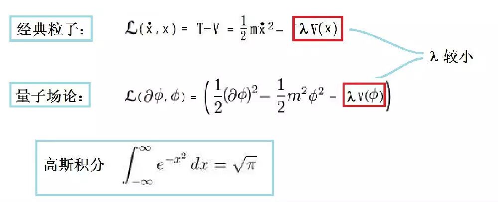动能部分稍微好办一些,因为它们是场(或者场的微分)的二次项。如果没有后面势能lV(f)一项的话,经过一系列繁复的代数运算之后,最终可以将路径积分的结果表示成图中所示的高斯积分的形式。势能项描述的是相互作用,当相互作用比较小而被忽略不予考虑的情况下,得到的便是“自由场”的结果。