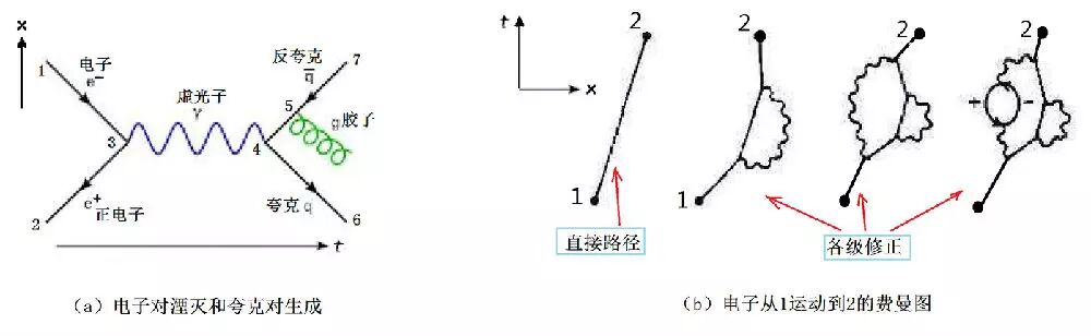 图12-3a:时空点1的电子,和时空点2的正电子,在时空点3相遇并湮灭,产生一个虚光子。虚光子运动到时空点4时,生成夸克和反夸克,反夸克在时空点5发射一个胶子。最后,夸克运动到6,反夸克到7。