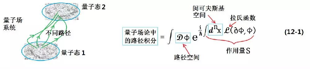 路径积分应用到量子力学和量子场论的区别只是在于积分的空间不同,以及拉格朗日量表达式的不同。量子场论路径积分表达式(12-1)中包含两个积分:一是对所有路径贡献的概率幅求和,对各种不同系统而言,在它可能历经的所有路径构成的空间中进行。出现在指数函数中的另一个积分,是对某个给定的路径,从拉格朗日函数密度计算作用量时的积分,在场分布的真实空间中进行。因为量子场论是量子力学和相对论结合而成,第二个积分空间的维数通常是(n=1+m)。当m=3时,这是包括时间和3维空间的闵可夫斯基空间(不考虑引力的话)。当m=0的时候,计算作用量的积分空间只有一维时间轴(t),公式(12-1)便简化回归到单粒子量子力学的情况。另外,空间维数m也可以扩展到大于3的情形,等于10或者别的什么正整数值都行,其数学表达式都是类似的,只需要根据具体情况将物理意义加以推广到高维而已。
