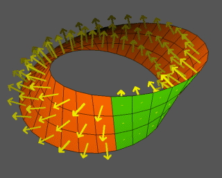 这个莫比乌斯环的重要特性是:虽然在每个局部都可以说正面反面,但整体上不能分隔成正面和反面,即这种曲面是只有一个面的 “单侧曲面”。