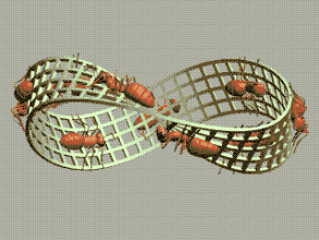 在所有莫比乌斯环的艺术作品中,荷兰的图形艺术家M.C.埃舍尔(M. C. Escher,1898~1972)的《莫比乌斯带》系列最能表现莫比乌斯环的生动形象,同时也是最具震撼力的作品了。