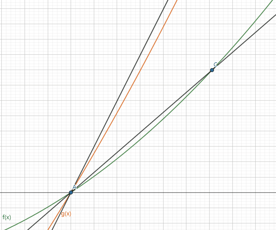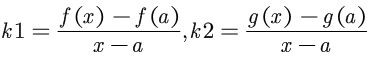 所以我们需要构建两个函数 f(x) 和 g(x) ,且经过 A (a , 0) , 点B、点C分别是f(x)、g(x) 上的一点,当B、C两点越靠近点A时,曲线AB和曲线AC就越接近一条直线,这因为可微函数局部是线性,设k1、k2分别为 直线AC、AB的斜率。
