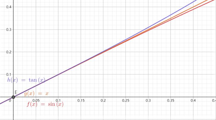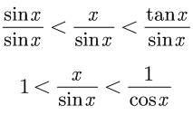 从上图可以看出,在 x 趋近于0 时,则有 sin x < x < tan x ,