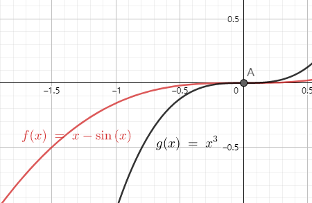 上图为f(x)=x-sin x 和 g(x)=x^3 的图象,可看出 x - sinx 和 x^3 在x=0处可求导,(x^3)' ≠ 0 ,且它们的极限都为0,此时我们的主角--洛必达法则准备登场了,我们分别对未定式的分子和分母求导,就可以得到