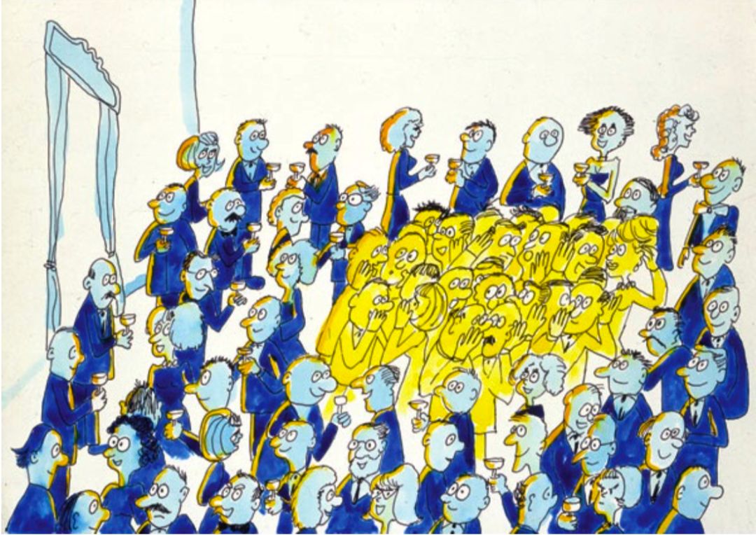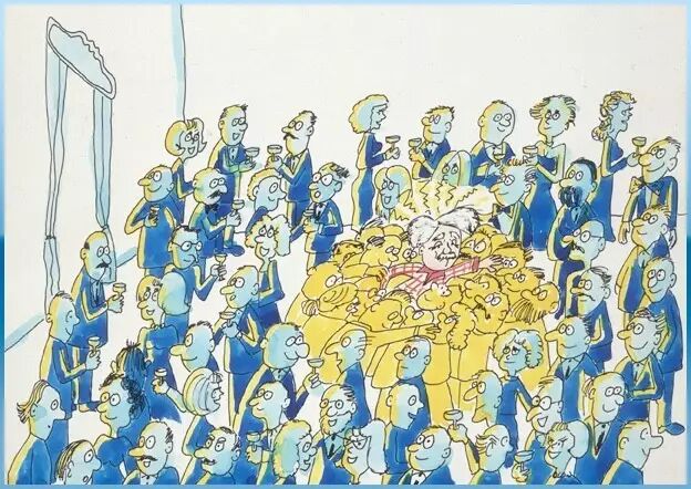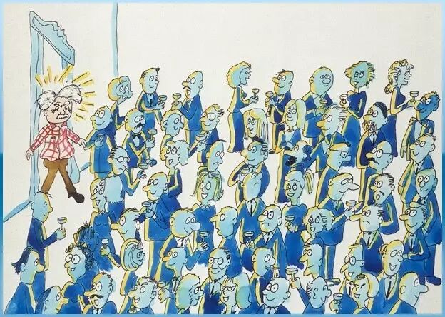 在某个时刻,一位知名的物理学家突然走进了派对之中,当他穿过人群的时候造成了小骚动,他的仰慕者纷纷向他靠拢。