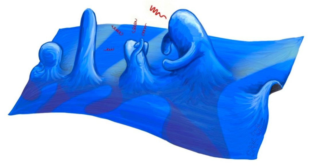 同样的道理,在粒子经过时,希格斯场的局部也会出现畸变。畸变,即环绕在粒子周围的场的聚集,产生了粒子的质量。