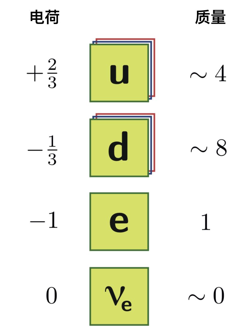 质子包含了两个上夸克和一个下夸克,我们会表示为:p=(uud),中子包含了两个下夸克和一个上夸克:n=(ddu)。