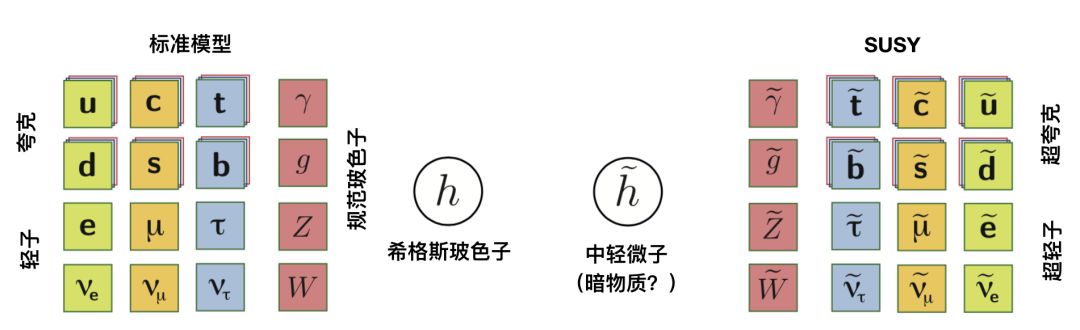 超对称理论(SUSY)是标准模型的一个备受欢迎的扩展。简单来说,SUSY能克服标准模型的一些理论缺陷。据SUSY看来,标准模型中的每个粒子都有一个对应的隐藏拍档。本质上,SUSY将标准模型的周期表翻了个倍: