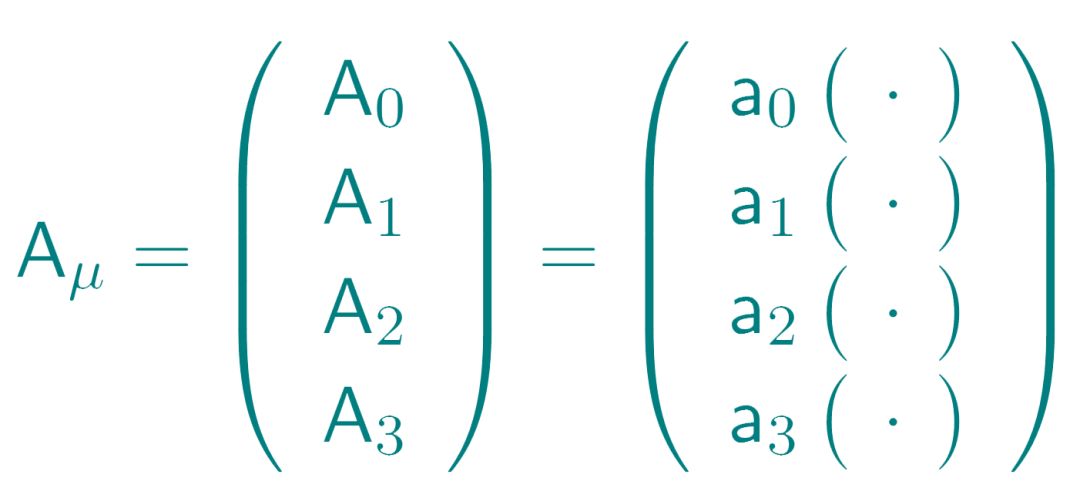 两种核力拥有相同的作用方式,也有与电场、磁场和矢量势对应的类比。除了下面这个情况,矢量的每个分量本身就是一个矩阵(·)