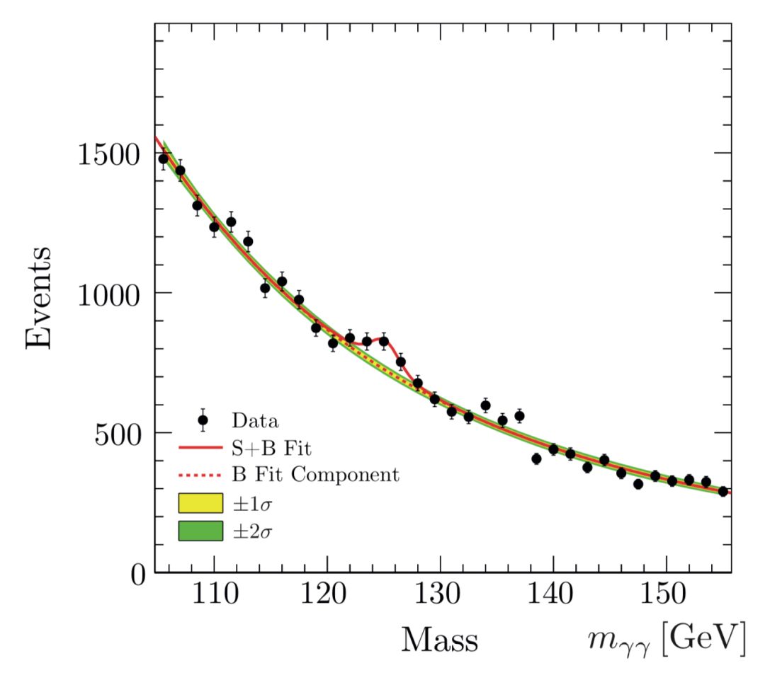 在过去的几十年里,实验粒子物理学家一直被寻找希格斯玻色子这项任务占据。6年前,他们终于发现了它!希格斯粒子的质量是质子质量的133倍(下图曲线中凸起的部分):