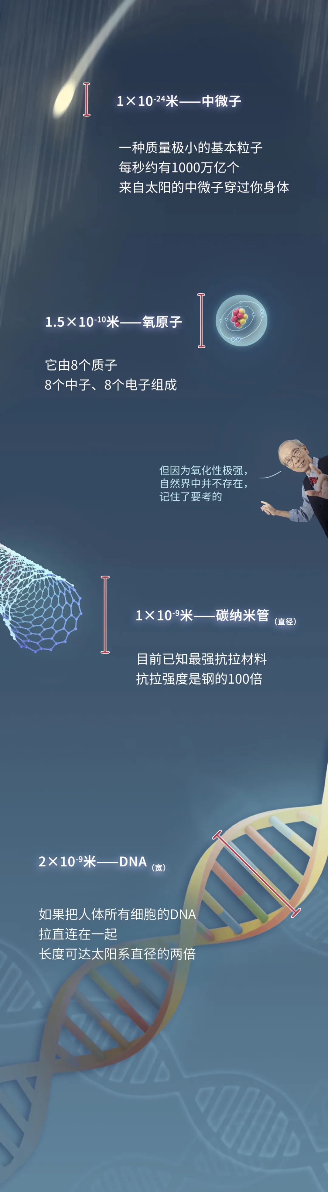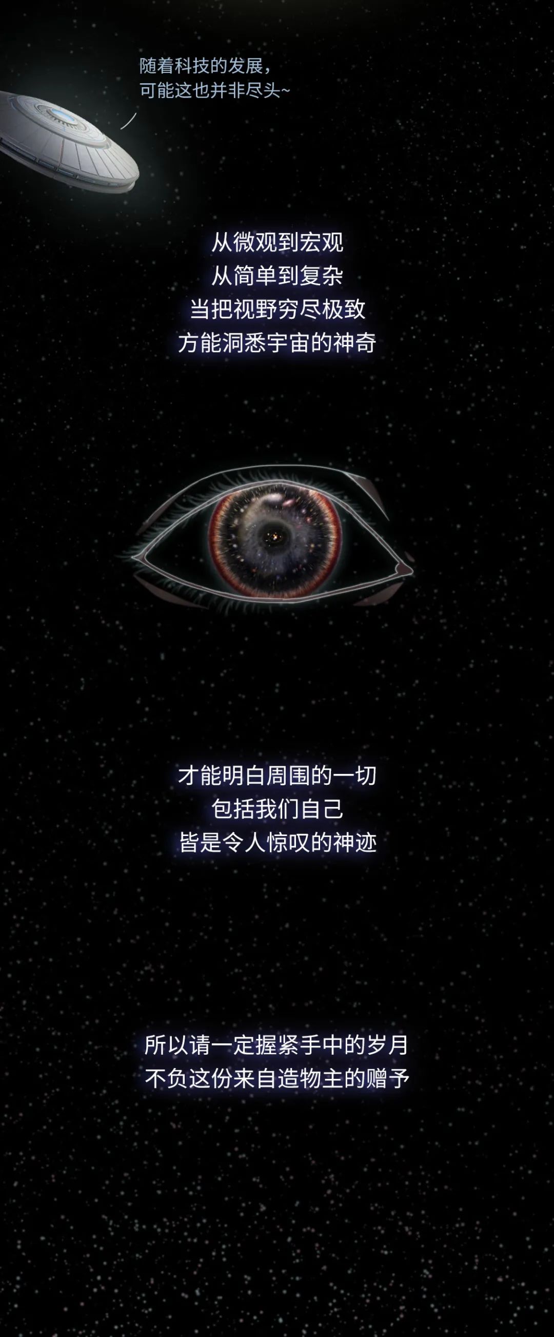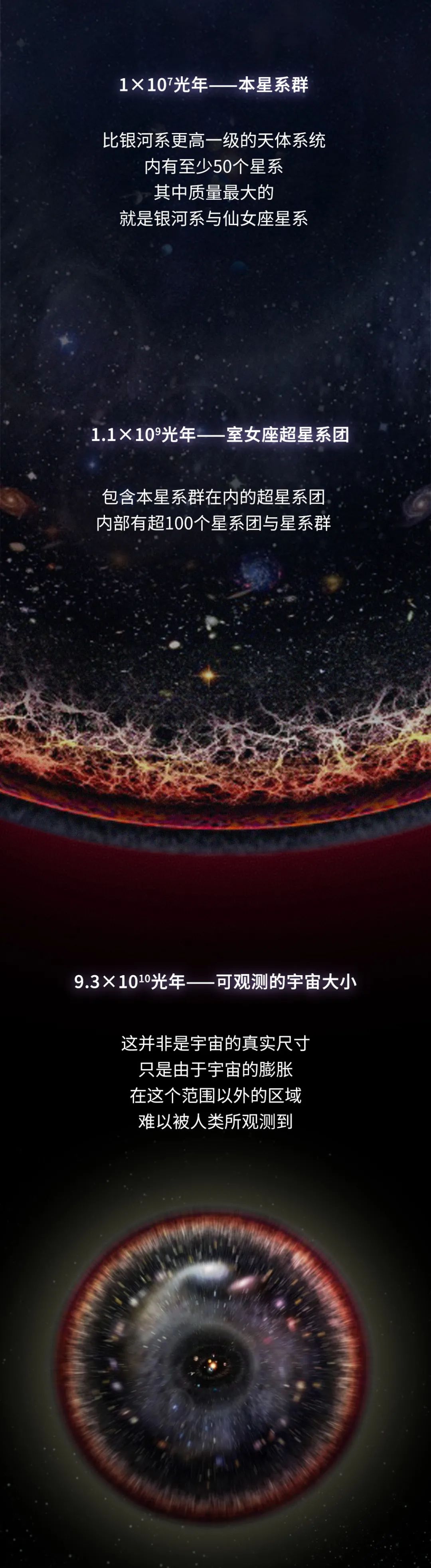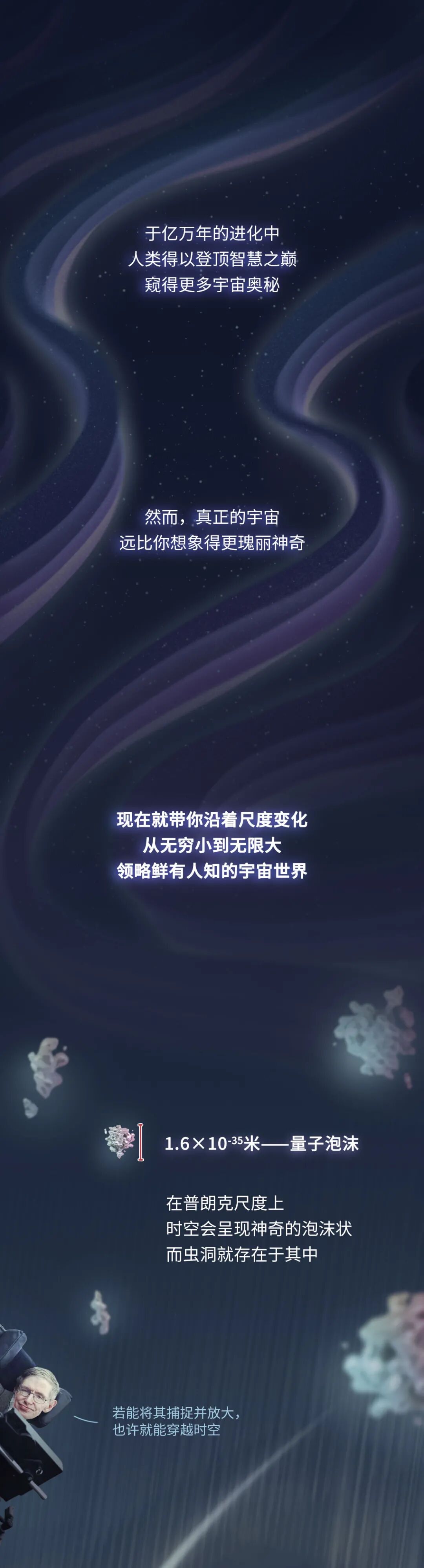 •当进入极致的微观世界,惠勒认为,不确定性原理可能意味着在足够短的距离和足够短的时间间隔内,时空的几何形状会发生波动。这些波动可能大到足以导致从宏观尺度上看到的平滑时空出现显著偏离,从而使时空具有“泡沫”特征。霍金认为这可能是破解用虫洞进行空间旅行的一个方向。 •上文提到的最大尺度的数据,也只是可观测宇宙的大小,那么真实的宇宙有多大呢?按照宇宙大爆炸理论,假设宇宙在爆炸后的10~37秒开始膨胀,那么理论上宇宙的尺度大约等于光速乘以它的年龄,最终的计算结果约为1.5×1034光年。 •从微观看到宏观,不禁让人慨叹:哀吾生之须臾,羡宇宙之无穷。人类自诩为地球之主,可纵览宇宙的尺度,我们也不过沧海一粟,仍有许多未知之物。但尽管我们可能永远无法一窥宇宙的全貌,也不妨碍我们怀揣好奇砥砺前行。毕竟,身处深渊,也总要有人仰望星空。