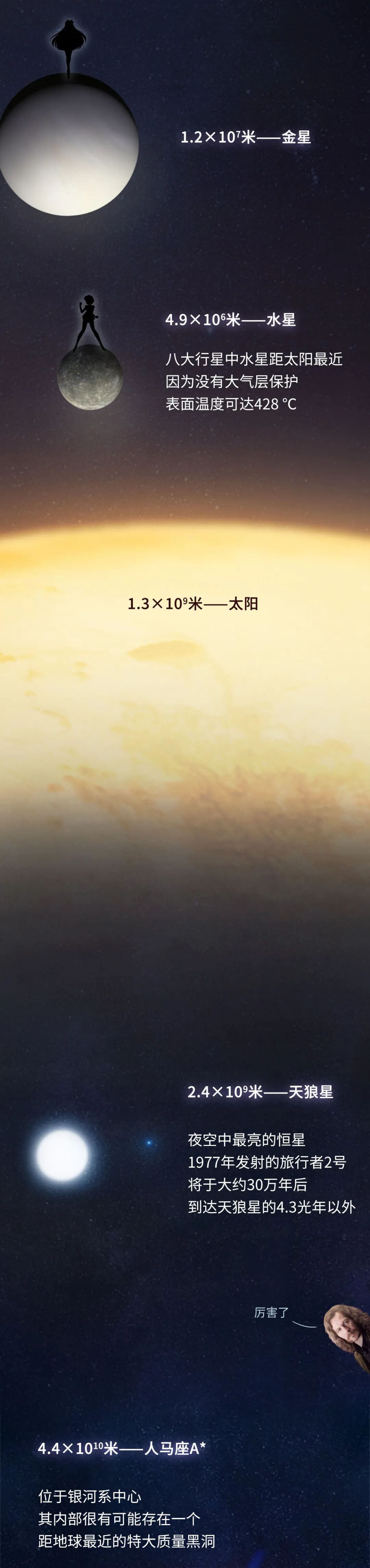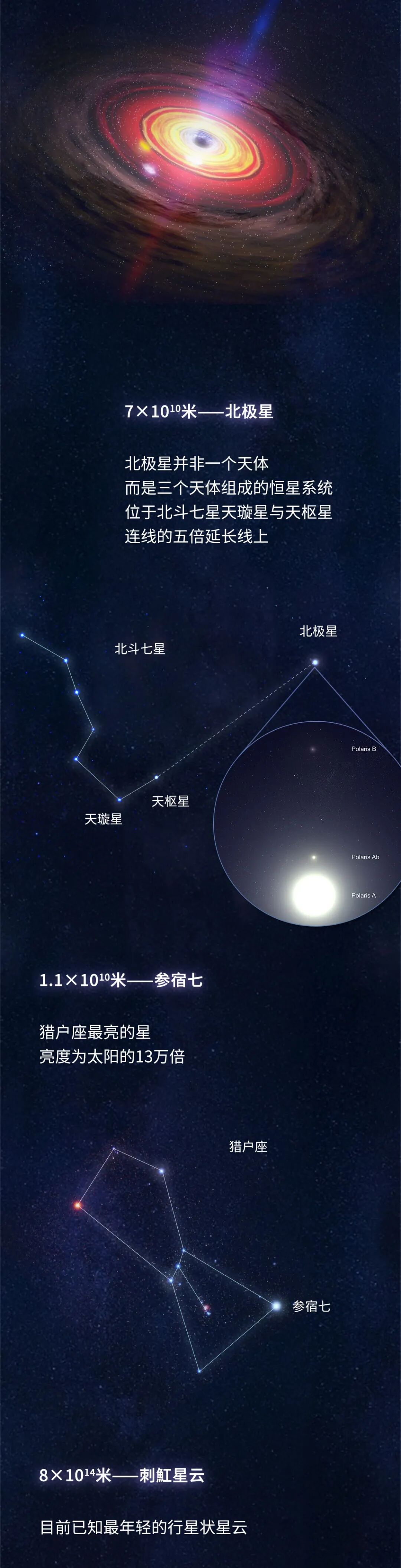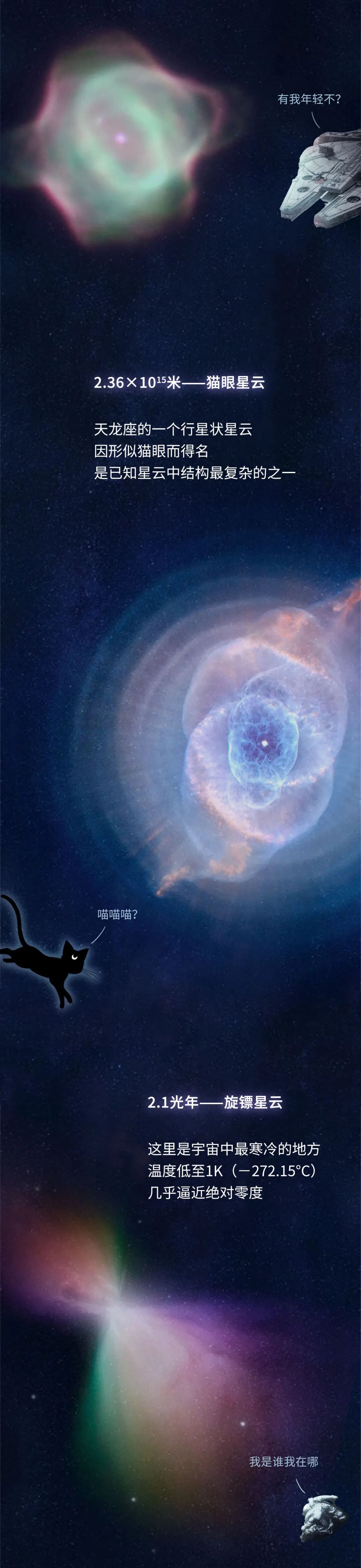 •当进入极致的微观世界,惠勒认为,不确定性原理可能意味着在足够短的距离和足够短的时间间隔内,时空的几何形状会发生波动。这些波动可能大到足以导致从宏观尺度上看到的平滑时空出现显著偏离,从而使时空具有“泡沫”特征。霍金认为这可能是破解用虫洞进行空间旅行的一个方向。 •上文提到的最大尺度的数据,也只是可观测宇宙的大小,那么真实的宇宙有多大呢?按照宇宙大爆炸理论,假设宇宙在爆炸后的10~37秒开始膨胀,那么理论上宇宙的尺度大约等于光速乘以它的年龄,最终的计算结果约为1.5×1034光年。 •从微观看到宏观,不禁让人慨叹:哀吾生之须臾,羡宇宙之无穷。人类自诩为地球之主,可纵览宇宙的尺度,我们也不过沧海一粟,仍有许多未知之物。但尽管我们可能永远无法一窥宇宙的全貌,也不妨碍我们怀揣好奇砥砺前行。毕竟,身处深渊,也总要有人仰望星空。