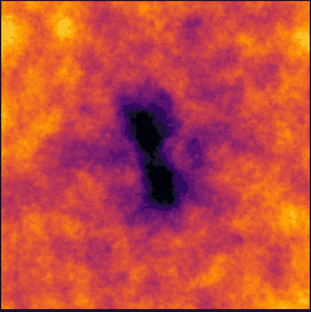 叠加的成对的星系团的画面:竖直排列的两个黑点是两个星团,由于湍流它们表现粗了消偏振,而外部区域和星系团之间的区域都高度偏振。(图/Tessa Vernstrom)