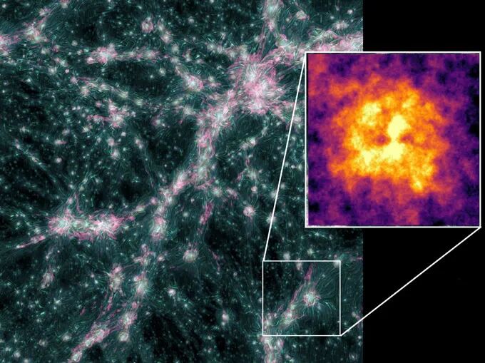 图中图显示的是在模拟的宇宙网中,通过结合许多观测到的射电图像所能生成的画面。(图/F.Vazza, D.Wittor, J.West)