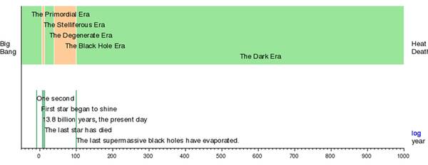 最后,一切的消失了。宇宙中只剩小了能量极低的亚原子粒子和光子。这是10^92到10^93年以后。这是,我们可以有把握地说,宇宙已经死了。
