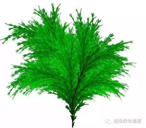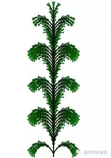 这些L系统 (Lindenmayer) 与其说是数学图形,倒是更像一些异域的蕨类植物。不过它们都是通过重复的样式绘制出来的。“这些L系统分形的两个角度由字母A和B给出,而它们的两个距离由字母C和D给定。”