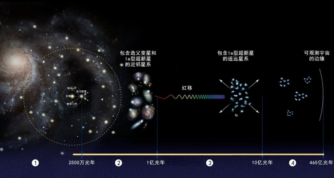 天文学家会通过宇宙距离阶梯来估算天体的距离:1. 天文学家通过视差法来计算银河系中造父变星的距离,造父变星变明或变暗与它们的内禀亮度有关;2. 天文学家会在那些包含Ia型超新星的邻近星系中寻找造父变星。将这些造父变星的亮度与银河系中的那些造父变星的亮度进行比较,就可以估算出邻近星系的距离;3. Ia型超新星会爆发出相似的能量,所以有相似的内禀亮度。在那些遥远的星系中寻找Ia型超新星,并将它们的亮度与邻近星系中的进行比较,就可以得出遥远星系的距离。由于这些遥远星系发出的光会因宇宙的膨胀而被拉伸,或说红移。通过比较红移和通过其他方法测量的距离,就可以估算宇宙的膨胀率;4. 通过估算出的宇宙膨胀率和已知最遥远星系的距离,就可以推算出可观测宇宙的边缘。| 图片素材来源:NASA, ESA, A. Feild (STScI), and A. Riess (STScI/JHU) https://esahubble.org/images/heic1611a/