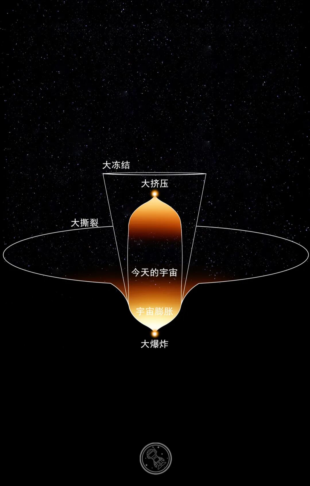 但问题是,我们对暗能量的本质一无所知。如果暗能量是个不会随时间改变的常数,那么宇宙的膨胀最终会变成恒定的,星系团之间会彼此离得越来越远。这种情况被称为大冻结,所有的恒星最终都会死亡,宇宙中剩余的物质温度会趋于平衡。在没有温度差异的情况下,能量无法流动,所有一切有趣的事物都将不会发生。但如果暗能量不断增强,宇宙将不断加速膨胀,最终宇宙会迎来大撕裂。原本由引力束缚住的系统将被暗能量拉开。