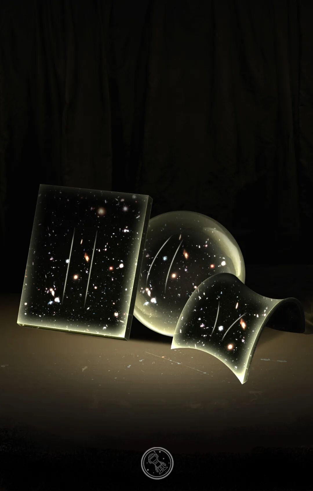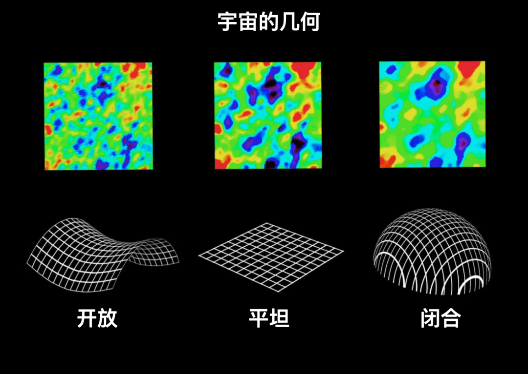 当宇宙学家谈论宇宙的几何时,他们指的是时空的整体形状。根据爱因斯坦的广义相对论,空间本身是可以被质量弯曲的。因此,想要知道宇宙的形状,关键在于测量它的密度。科学家会通过比较宇宙的临界密度与实际密度,来推断宇宙的形状:开放:实际密度<临界密度,宇宙中没有足够的物质来阻止宇宙的膨胀,宇宙会永远膨胀下去。 平坦:实际密度=临界密度,宇宙恰好包含了足够的质量使膨胀停止。 闭合:实际密度>临界密度,宇宙包含足够多的质量来阻止膨胀。