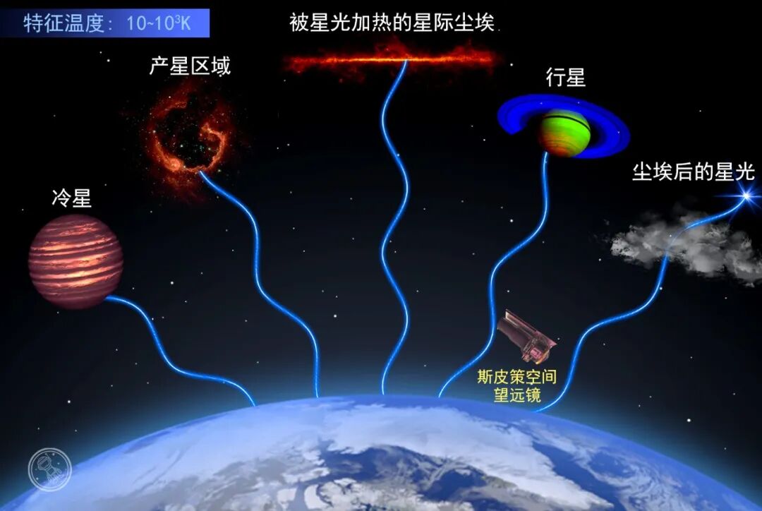 红外线主要是热辐射,大多数红外线探测器需要被冷却到极低温度才行。由于红外线可以穿透空间中厚厚的尘埃,所以透过红外线可以窥探恒星的形成区域和银河系的中心区域。红外光比可见光更适合观测低温天体,在近红外波段能观测到在可见光中不可见的冷星和冷星际云;在中红外波段可以很好地看到被恒星加热的尘埃。如果地基望远镜位于高海拔、大气稀薄的位置,就可以观测到接近可见光的近红外;长波长红外线是由太空望远镜观测的。