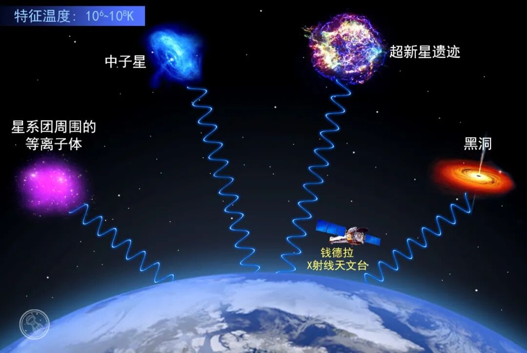 X射线是从几百万到几亿摄氏度的高温区域发射出来的电磁波。例如,表面温度超过1亿℃的中子星会释放出明亮的X射线;在本身并不能发光的黑洞周围,聚集着非常炽热的气体也会发射强烈的X射线;星系中的超新星爆炸产生的冲击波,会将气体加热到几百万摄氏度,那些区域也是X射线的发射区域。由于X射线会被地球的大气层吸收,所以X射线的观测工作主要由太空卫星进行。